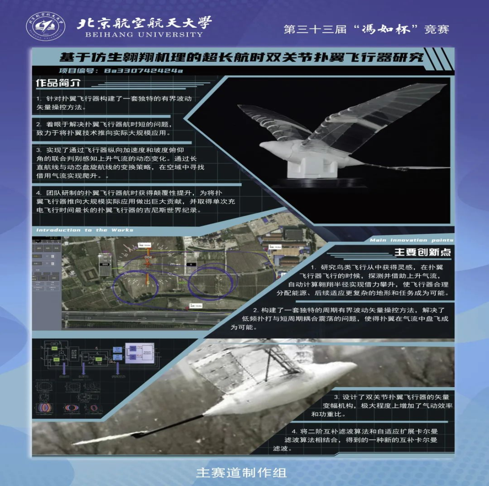 项目简介:续航短与操控难一直限制扑翼机投入实际应用的瓶颈。我们团队对扑翼平台进行整体优 化,攻克了扑翼振动下的惯导感知问题,解决了周期波动飞行下的强鲁棒姿态控制问题。同时 我们从鸟类御风翱翔现象中获得了提升扑翼机续航的灵感,完整设计并实现了"驭风"策略,大幅提升飞行任务时间,成功创造国际上首个扑翼类续航纪录。