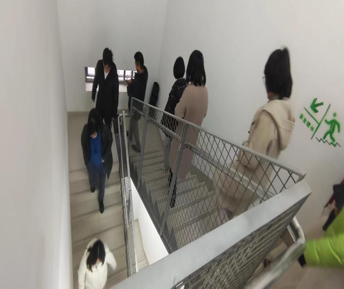师生在物业人员的指引下快速地从安全通道逃生,迅速到达新主楼E座西门外的疏散集合点,顺利完成了应急疏散环节。整个疏散过程紧张而有序,所有师生均撤离到了指定位置,未发生任何混乱和意外,达到了预期效果。