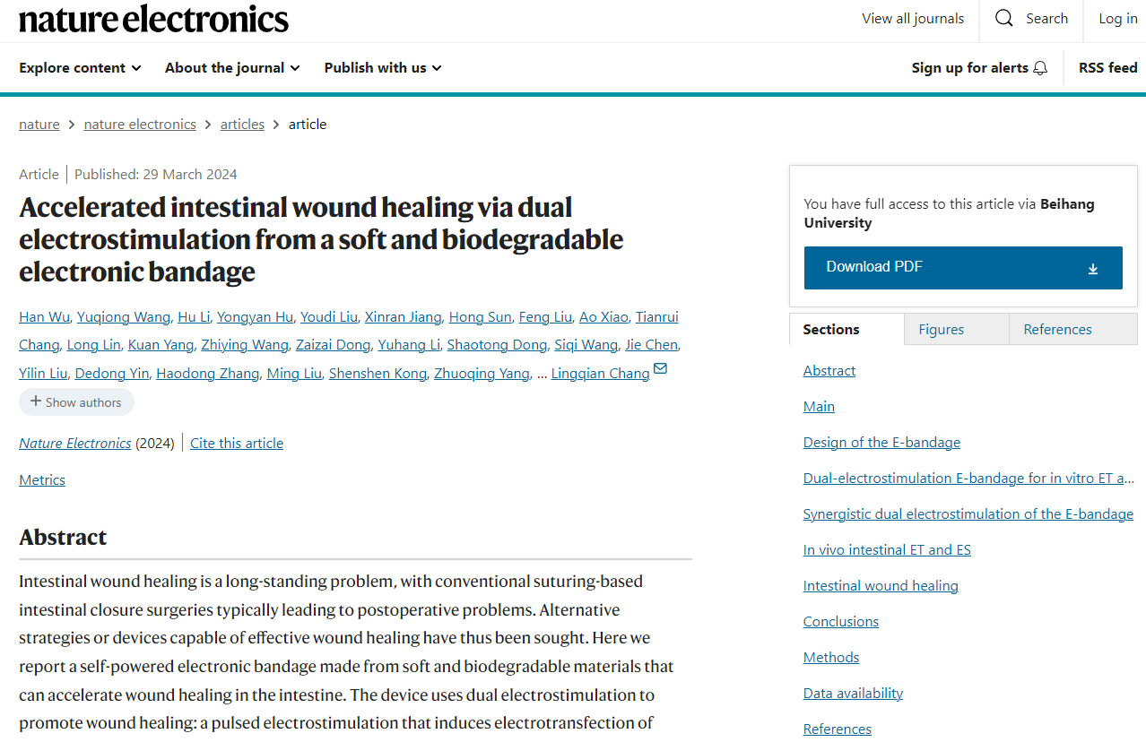 3月29日,常凌乾教授团队报道了一种柔性、可生物降解、自供电电子绷带,能够提供双模式电刺激,协同加速和改善肠道伤口愈合,并显著减少了术后并发症。相关成果以“Accelerated intestinal wound healing via dual electrostimulation from a soft and biodegradable electronic bandage”为题,发表在《Nature Electronics》上。北航生物与医学工程看球网站