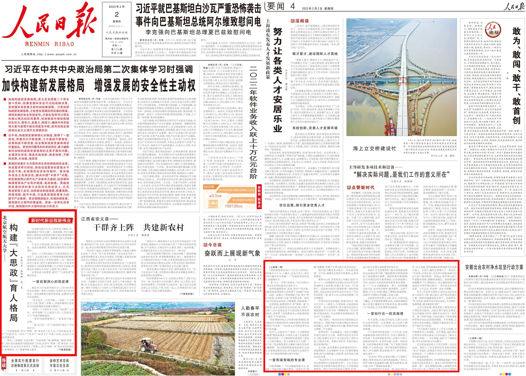 全覆盖,出版《北京航空航天大学课程思政优秀案例汇编(航空航天篇)》,提升教师课程思政建设能力,使课程思政元素成为专业教学的兴奋点和创新点。相关做法两次获《中国教育报》头版头条报道,2023年2月获《人民日报》头版报道。