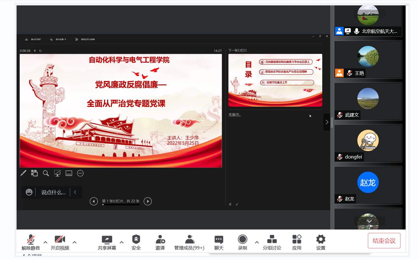 之后王少萍书记给全体党员宣贯了学校2022年全面从严治党工作会议精神,分别传达了校党委书记赵长禄、校长徐惠彬与校党委副书记、纪委书记何新洲的讲话精神,重点解读了校党委书记赵长禄2022年学校从严治党新要求,并强调要坚定不移推进全面从严治党向纵深发展,为开创中国特色世界一流大学建设新局面提供坚强政治保障,以实际行动和优异成绩迎接党的二十大胜利召开。
